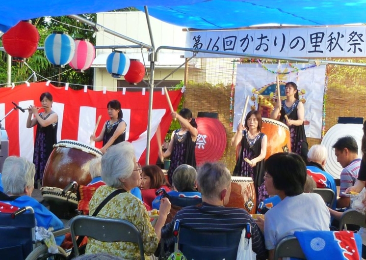 おどりのサムネイル よたよたのサムネイル 太鼓のサムネイル さん林のサムネイル 職員のサムネイル 懐メロにのサムネイル              青く澄みわたる爽やかな秋空のもと、ご来賓やご家族様も沢山お越しくださり、今年もかおりの里秋祭を開催。午前中は、優勝戦をかけた各種ゲームコーナーめぐり等を楽しまれ、午後からは、ボランティアの皆様による、演芸や和太鼓をご披露いただき、ご利用者様によるカラオケ大会や、職員コント、総おどりなど、数々の楽しい催しに、皆様の笑顔あるれる一日でした。