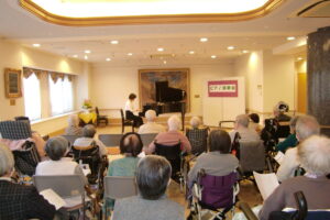 歌やピアノの連弾等、職員並びに入居者様ともに
