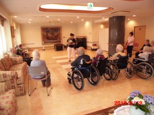 早速、入居者の皆様のおひざが大好きで動かない子、カスタネットをたたいたり呼び鈴を鳴らしたり、入居者の皆様にドックフードを隠してもらい、どこに入っているかを当てたりして、楽しい時間となりました。