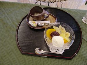 今月、メルシーカフェのメニューは”クリームあんみつ豆”でございます。