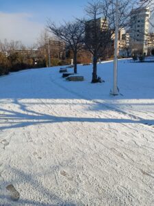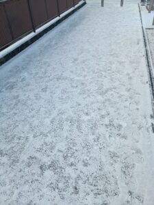 今日施設の周りに雪が積もっていたので