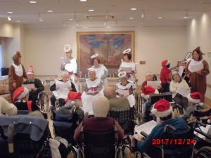 クリスマス会は、サンタさんの挨拶から始まり、事務所やフロアのスタッフの中で選りすぐりの皆さんでミュージックベル、そして聖歌隊の皆様で歌を歌い、最後はみんなで合唱するなど趣向を凝らした楽しいイベントとなりました。
